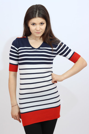 ОписаниеУдлиненный джемпер-туника в разноцветную полоску с рукавами чуть выше локтя. Украшен небольшими погонами на плечах и крупными золотистыми пуговицами.
