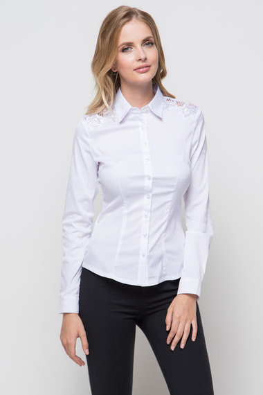 Классическая белая блузка с длинными рукавами, приталенного кроя. Плечи украшают оригинальные вставки из кружева.