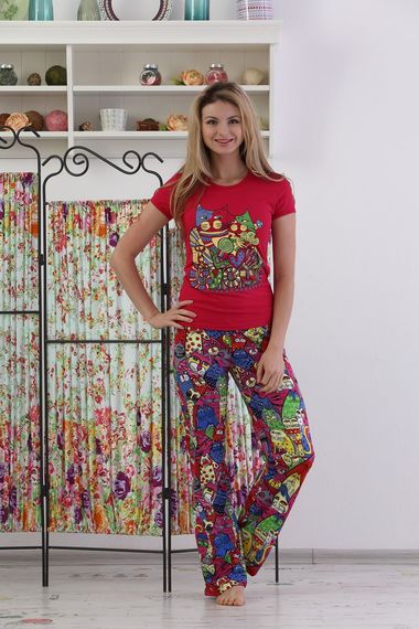 Красивый и практичный костюм для дома: брюки на поясе-резинке и футболка с коротким рукавом. Комплект выполнен из хлопоковых тканей-компаньонов с изображением очаровательных котов.